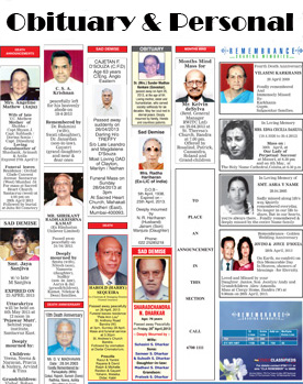 Book an obituary display advertisement in The Times of India newspaper any edition on death of the loved one. we provide the best obituary full page, half page and quarter pages to reach out sad messages to your friends, relatives and family.